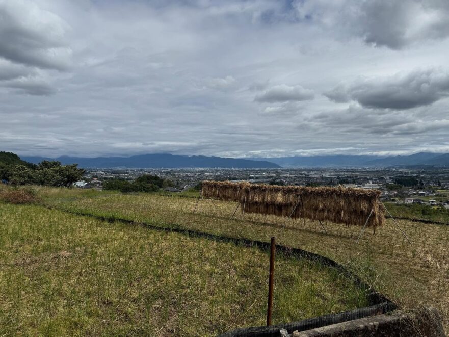 稲こき1回目、今日はワンオペ! 奥手の稲農林22号も順調。 眺めを楽しみながらいい汗流しました・。