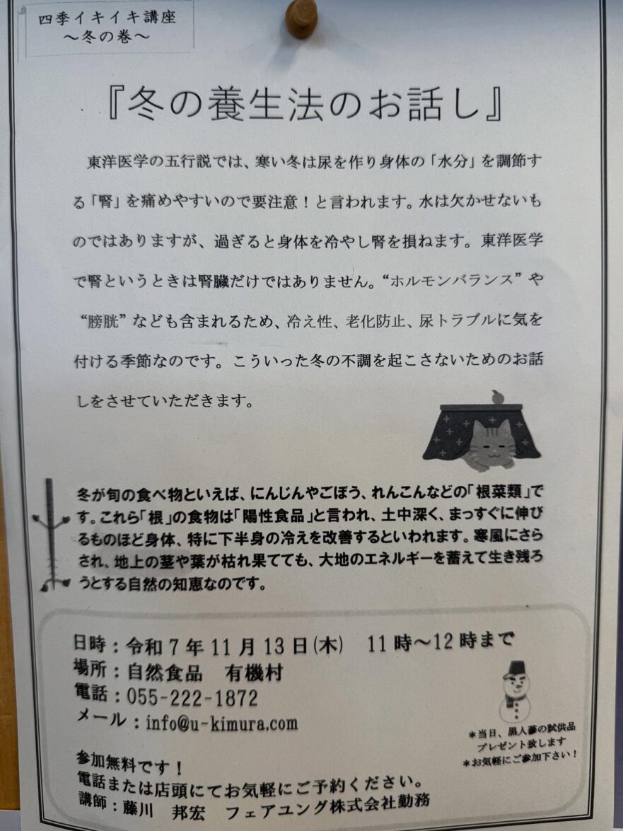 陰陽五行に基づく健康セミナー「冬の養生法のお話」11/13日有機村にて 自然食品 有機村 2025年10月25日いいもの・いいこと 毎回大評判!とってもためになるフェアユングさんの東洋医学陰陽五行に基づく健康セミナーです。皆様奮ってご参加ください。 & … Read More