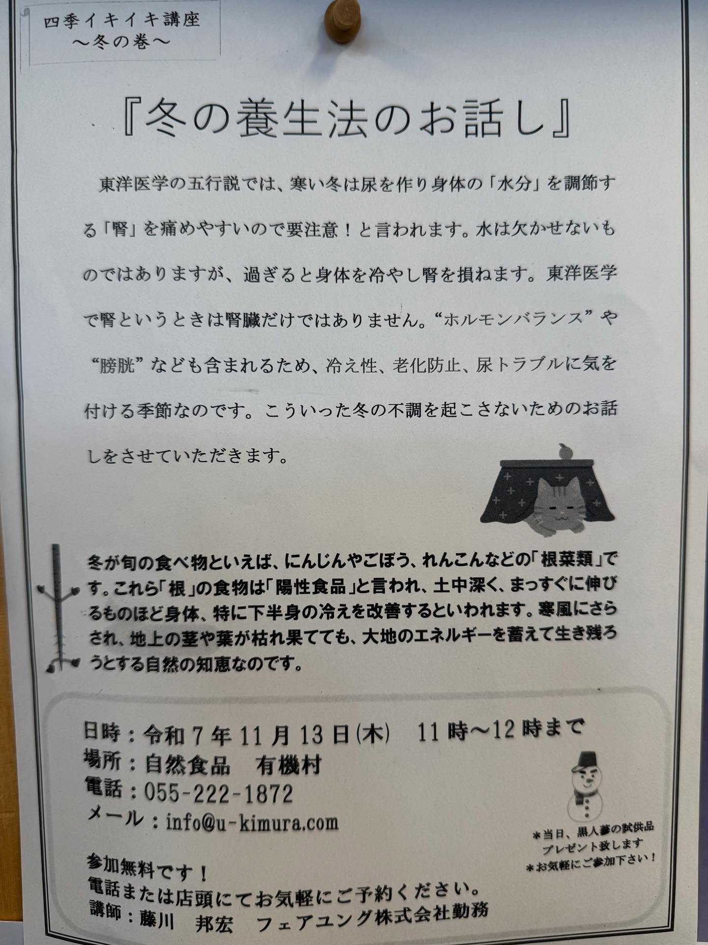 毎回大評判!とってもためになるフェアユングさんの東洋医学陰陽五行に基づく健康セミナーです。皆様奮ってご参加ください。